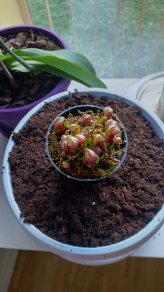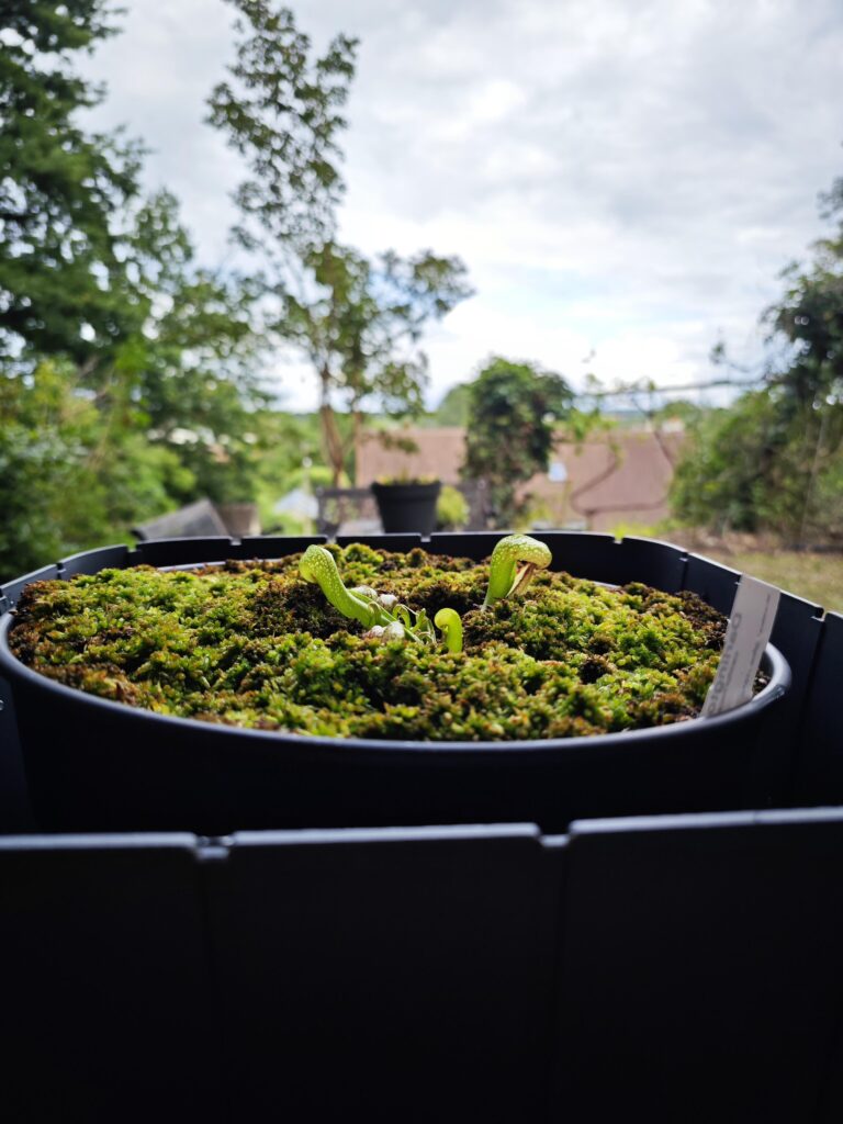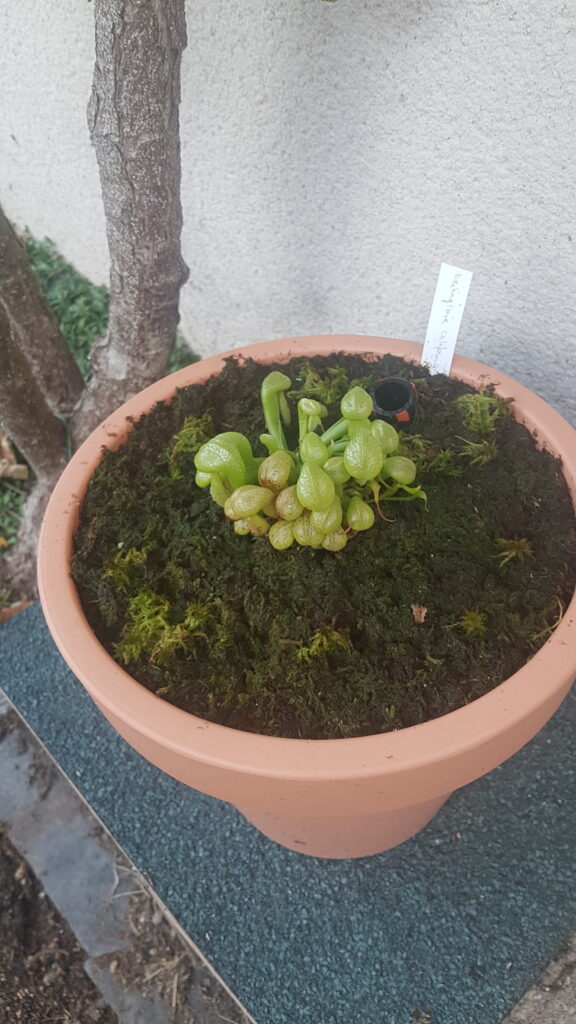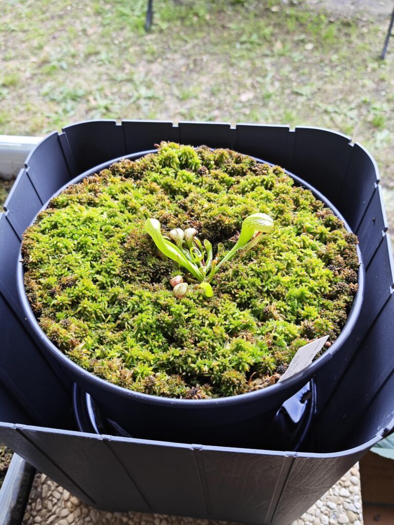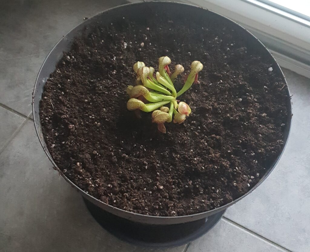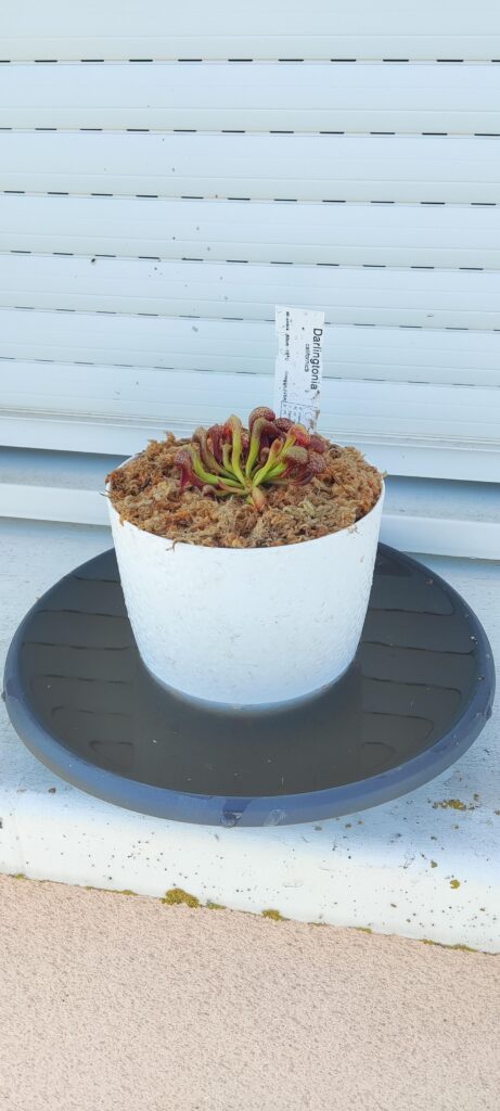 La taille du pot doit être de 5L (Ø ~ 20cm) minimum. Si vous avez de l’espace, n’ayez pas peur du ridicule ; plus votre pot plastique sera volumineux, plus votre Darlingtonia aura d’espace pour se développer convenablement. Taille de pot recommandé : 7,5L. Vous pourrez alors y ajouter quelques plantes compagnes : Dionaea muscipula et Drosera tempérées, Sarracenia