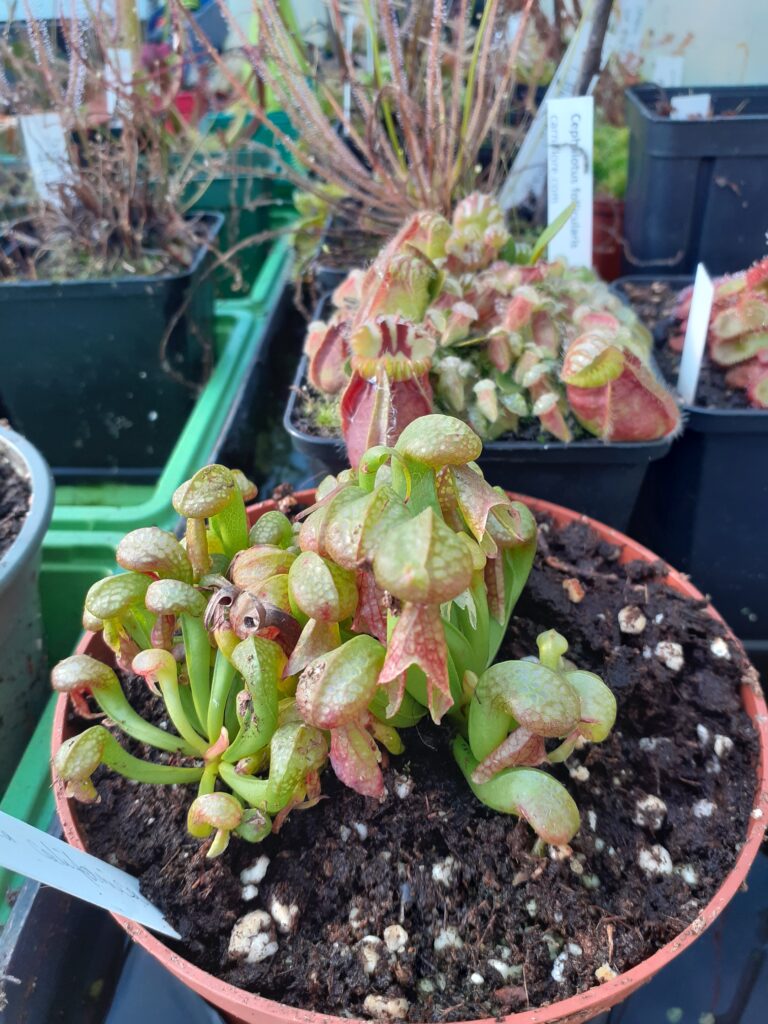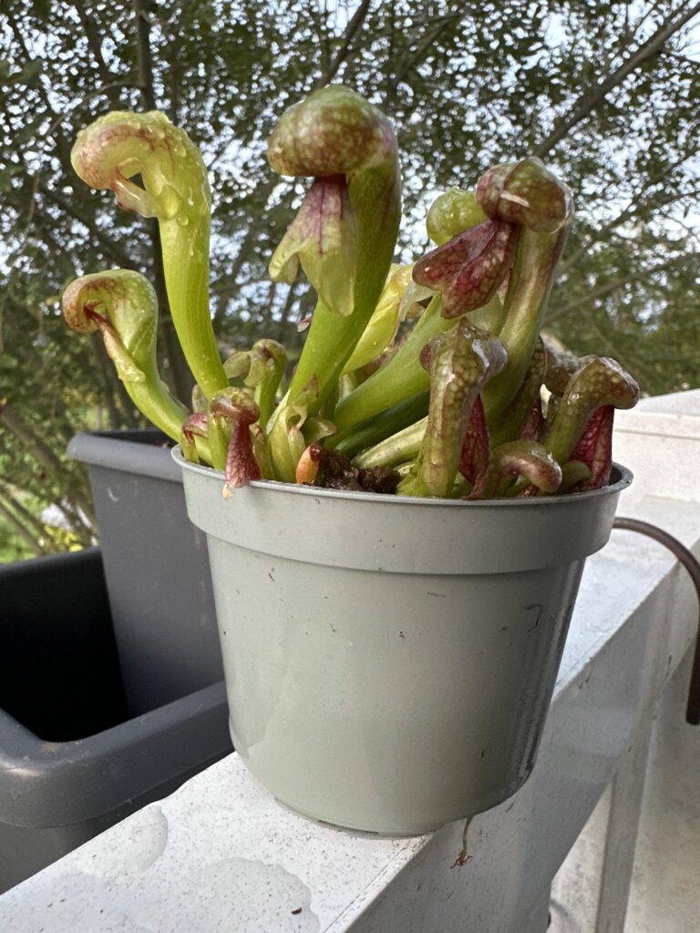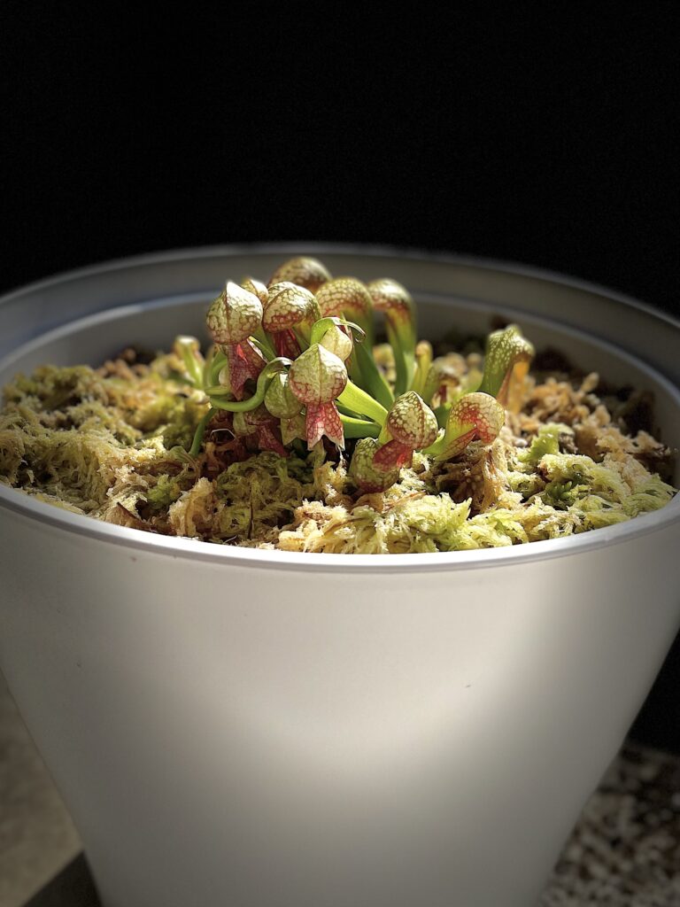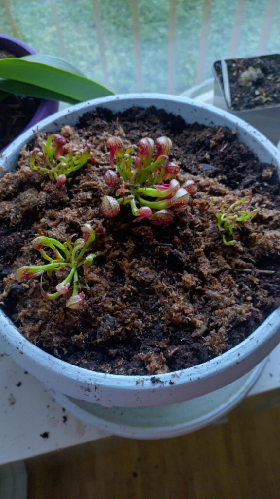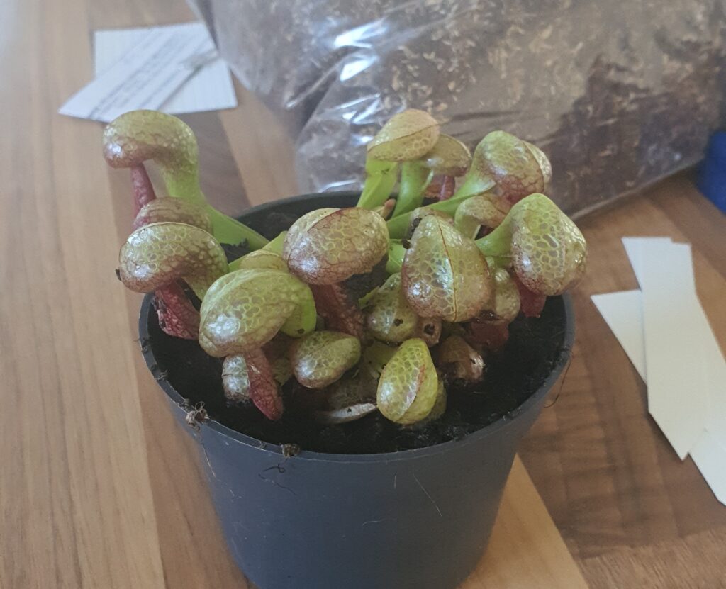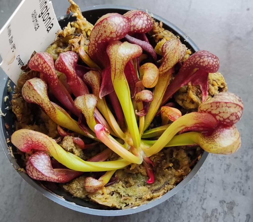 La taille du pot doit être de 5L (Ø ~ 20cm) minimum. Si vous avez de l’espace, n’ayez pas peur du ridicule ; plus votre pot plastique sera volumineux, plus votre Darlingtonia aura d’espace pour se développer convenablement. Taille de pot recommandé : 7,5L. Vous pourrez alors y ajouter quelques plantes compagnes : Dionaea muscipula et Drosera tempérées, Sarracenia
