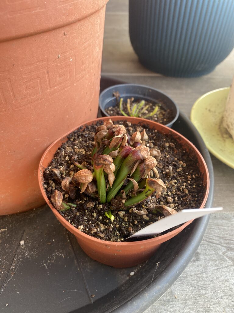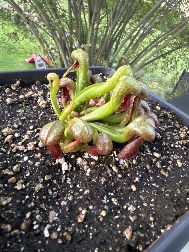 Quelle jolie plante la Darlingtonia. Elles sont arrivées sans encombre. L’emballage pour le transport était soigné et efficace. Les plants envoyés sont trapus, vigoureux avec un système racinaire bien développé. Bien que nous soyons avancé dans la saison, j’ai choisi de remporter un plan sur les deux. J’espère avoir fait le bon choix de substrat. J’en saurai plus à la sortie de l’hiver. Adrian Slack disait qu’il était nécessaire de rempoter les plants dans de la sphaigne pure et qu’un arrosage quotidien avec de l’eau fraîche était nécessaire… difficile. Présentement, je ne peux que recommander les Dents de la Terre.
