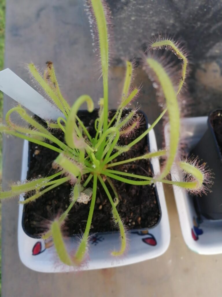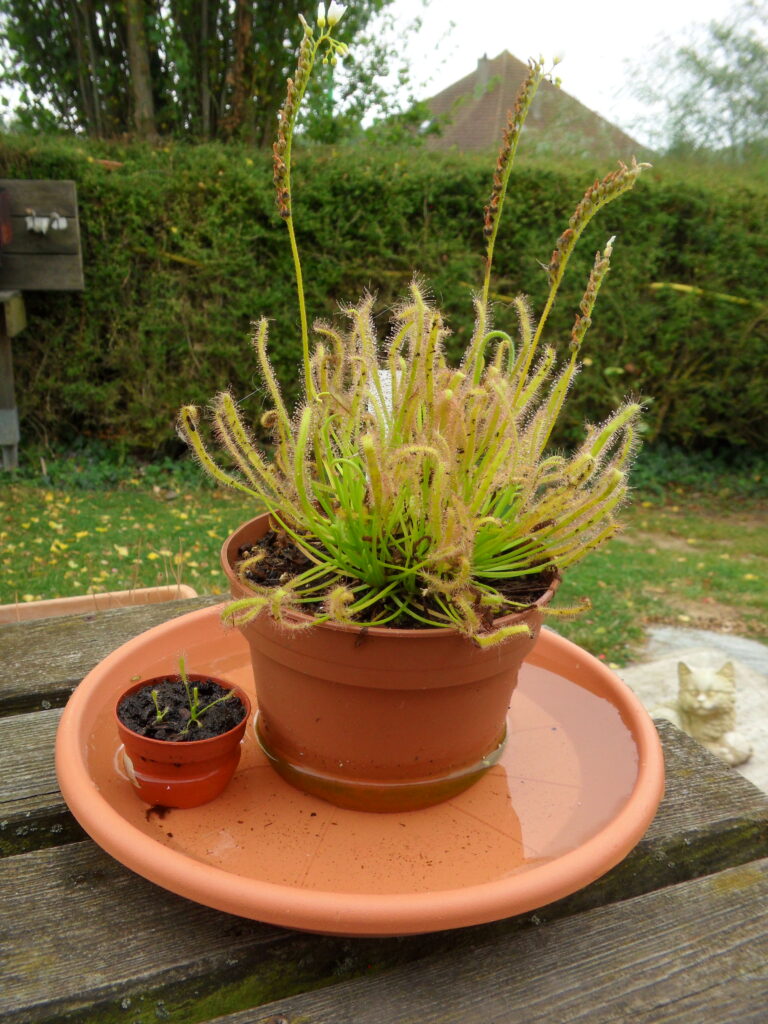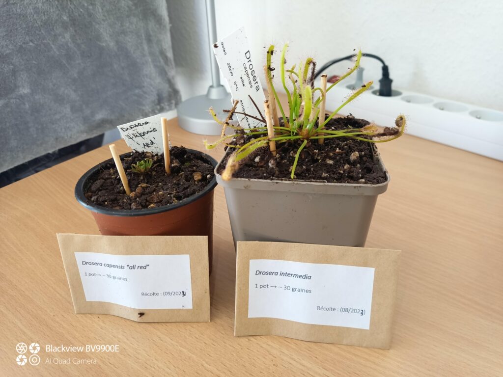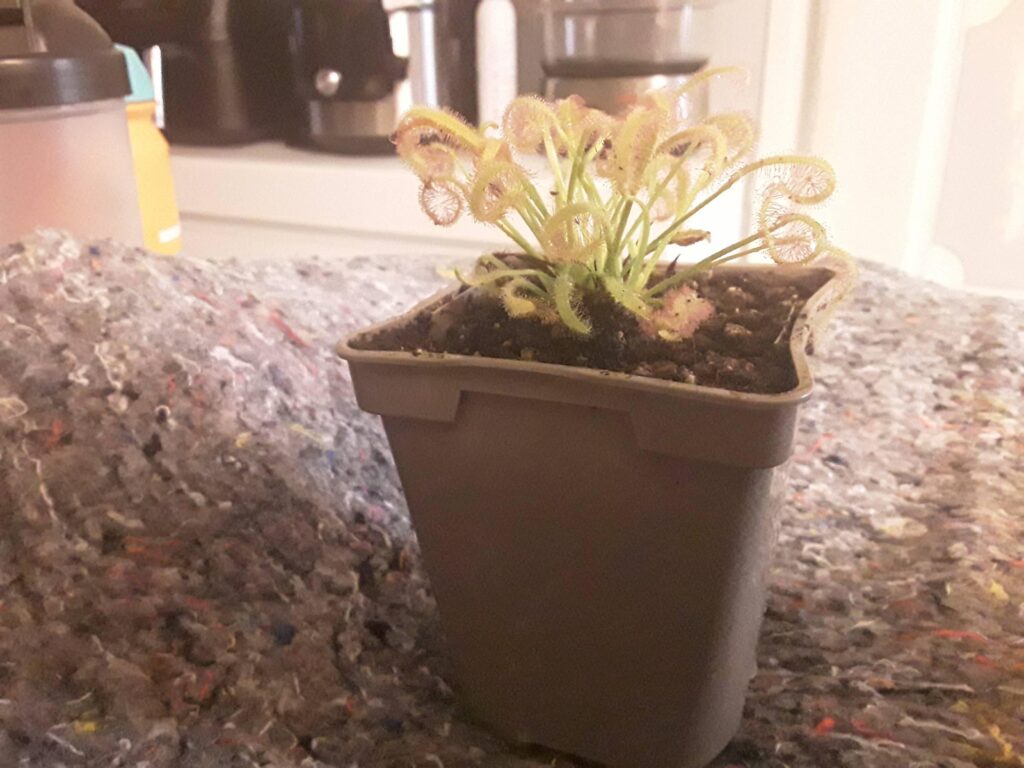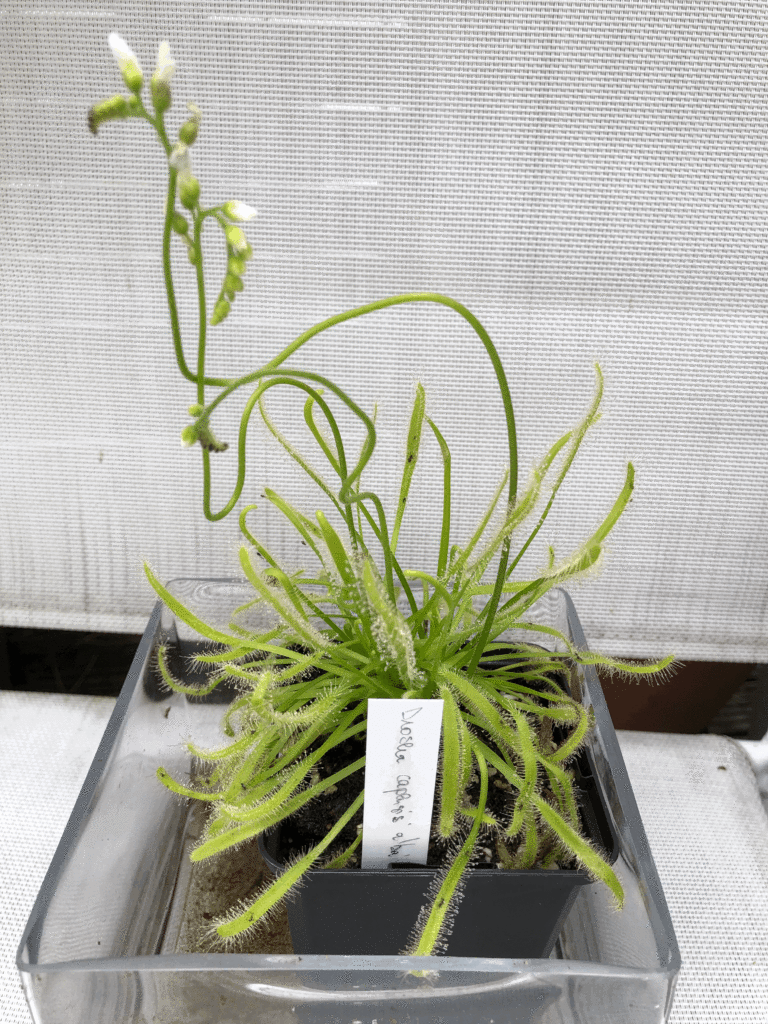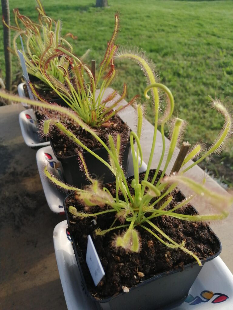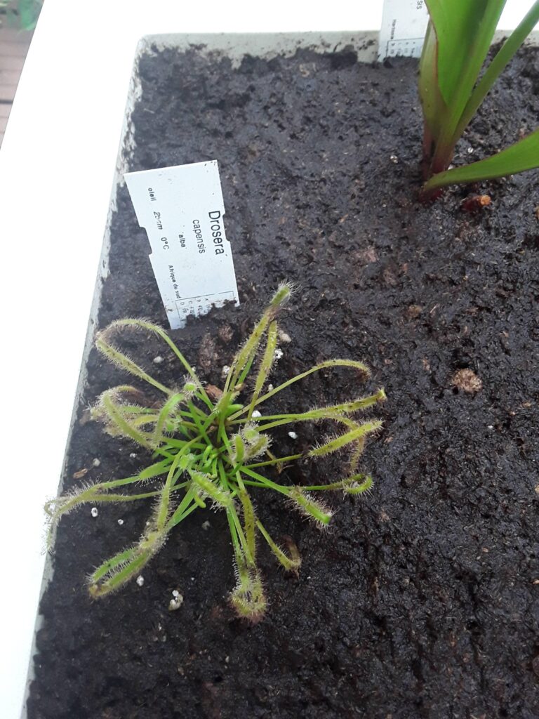 J’ai été ravie de cette 1ère commande par la poste qui devait faire le trajet France/Belgique ! La plante super protégée. Son installation dans le terreau spécial “plante carnivores”, et la voilà magnifique sur ma terrasse ! Cette Drosera capensis me donne 2 tiges florales dont j’espère récupérer les graines et suivant les tuto d’Enzo, les faire germer.
