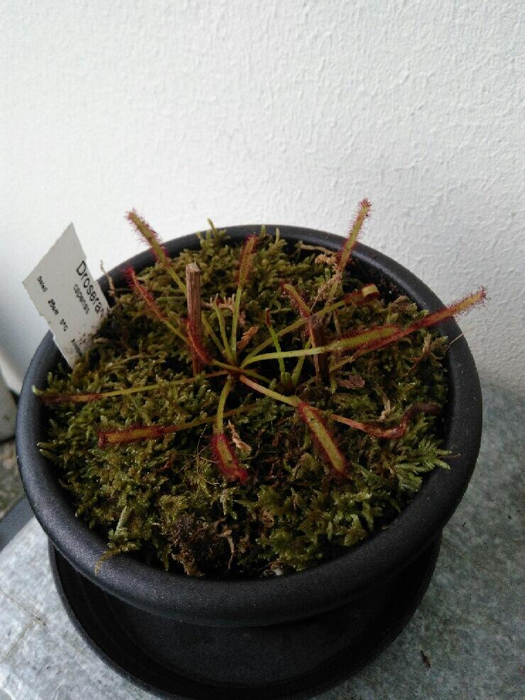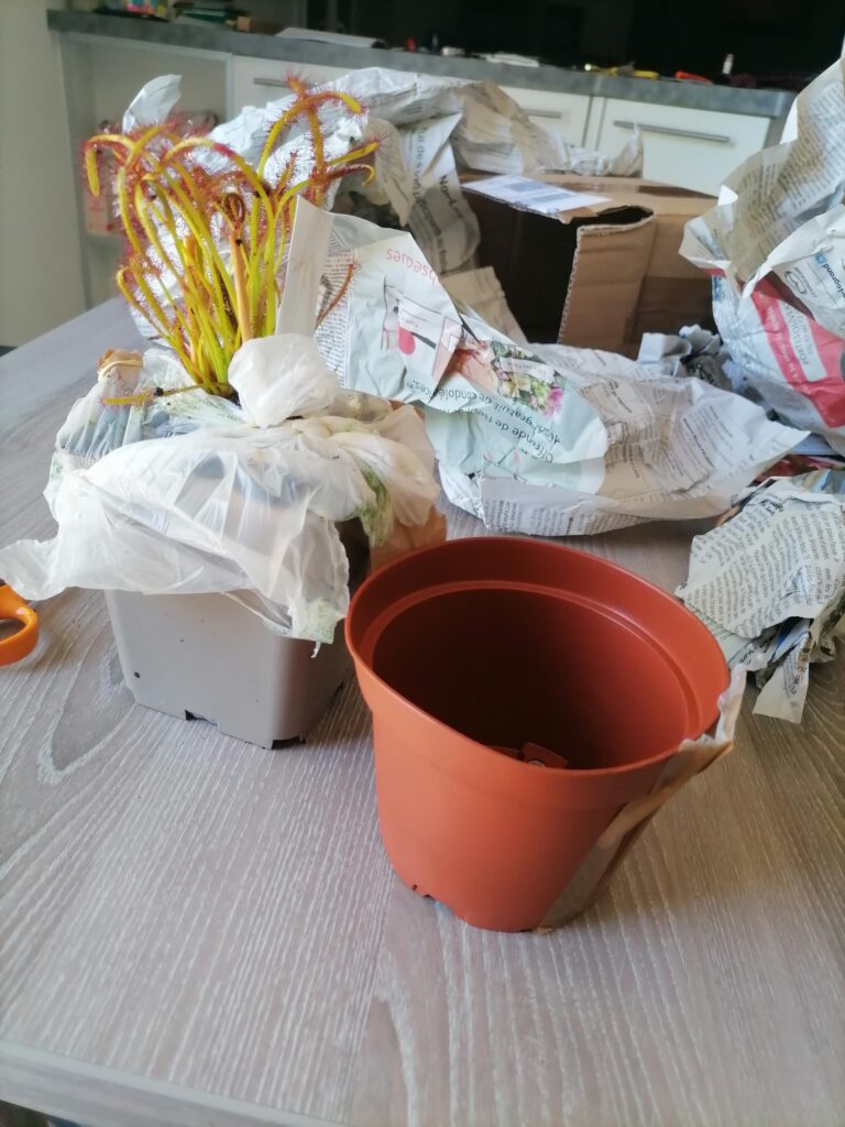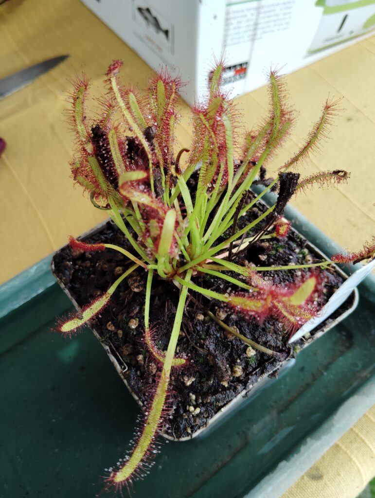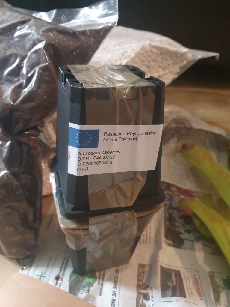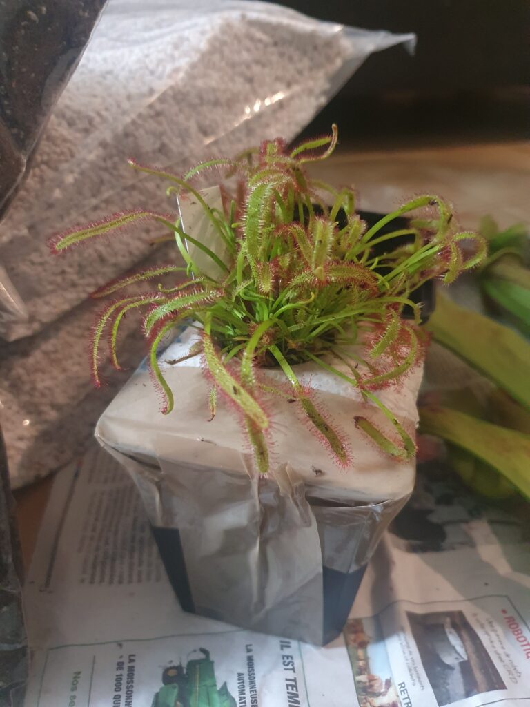 Plante bien emballé à la réception, photo prise 2 semaine après le rempotage, la reprise à été très rapide et le drosera ce plaît bien, hampe florale en préparation comme quoi le voyage l’a pas spécialement déranger! Très satisfait des services d’Enzo.