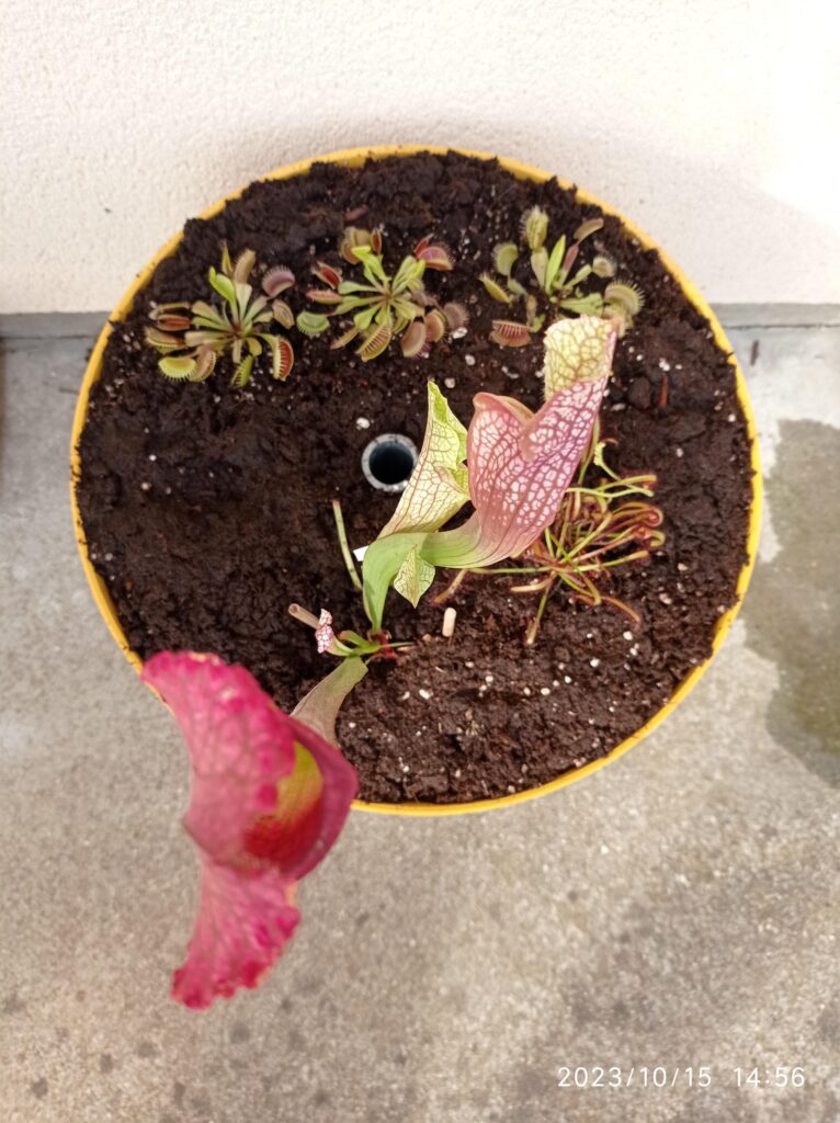La taille du pot doit être d’1L (Ø ~ 12cm) minimum. Si vous avez de l’espace, n’ayez pas peur du ridicule ; plus votre pot plastique sera volumineux, plus votre Drosera capensis aura d’espace pour se développer convenablement. Taille de pot recommandé : 3L. Vous pourrez alors y ajouter quelques plantes compagnes : Dionaea muscipula et Drosera tempérées.