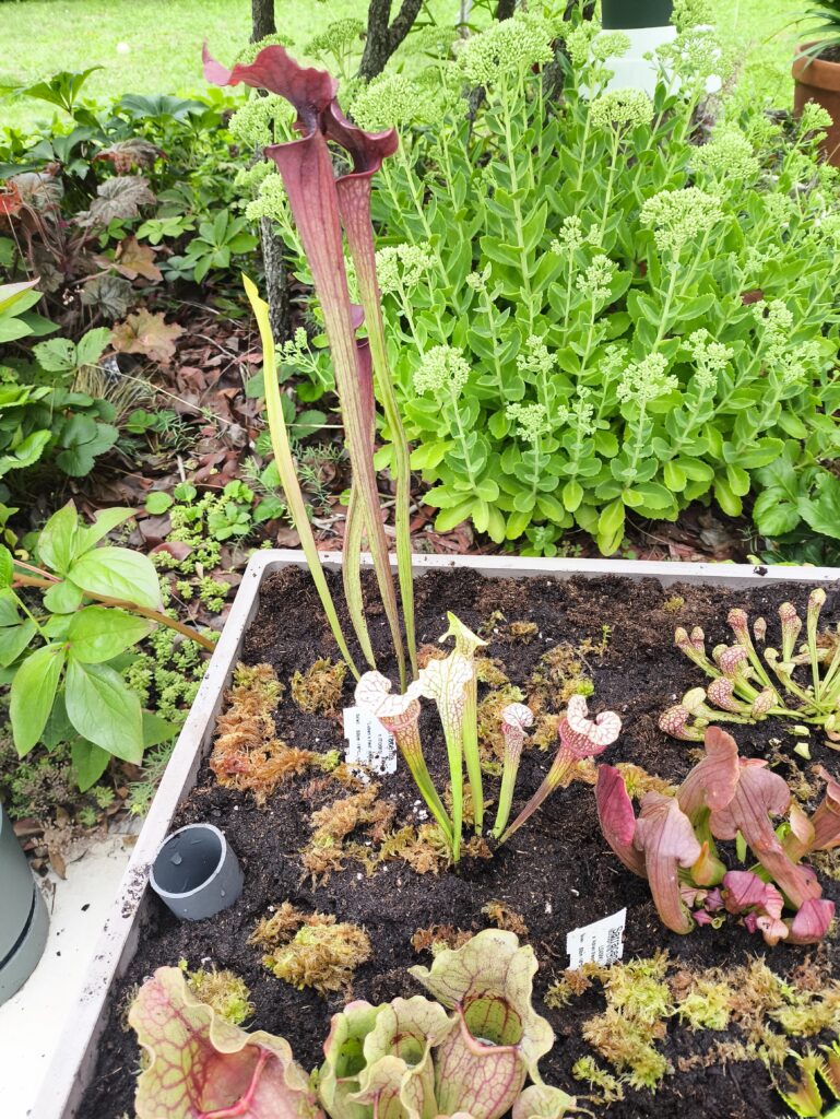 La taille du pot doit être d’1L (Ø ~ 12cm) minimum. Si vous avez de l’espace, n’ayez pas peur du ridicule ; plus votre pot plastique sera volumineux, plus votre Sarracenia aura d’espace pour se développer convenablement. Taille de pot recommandé : 3L. Vous pourrez alors y ajouter quelques plantes compagnes : Dionaea muscipula et Drosera tempérées.