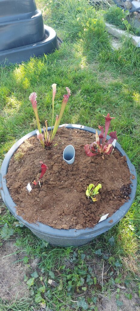 La taille du pot doit être d’1L (Ø ~ 12cm) minimum. Si vous avez de l’espace, n’ayez pas peur du ridicule ; plus votre pot plastique sera volumineux, plus votre Sarracenia aura d’espace pour se développer convenablement. Taille de pot recommandé : 3L. Vous pourrez alors y ajouter quelques plantes compagnes : Dionaea muscipula et Drosera tempérées.