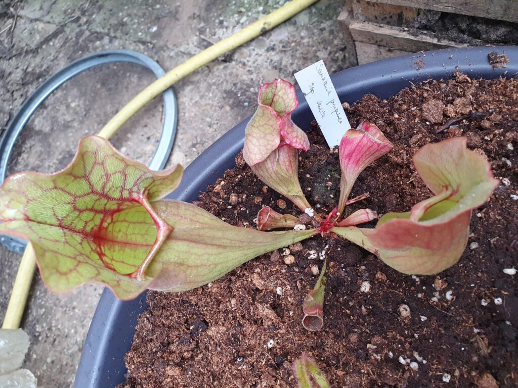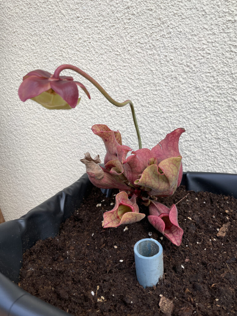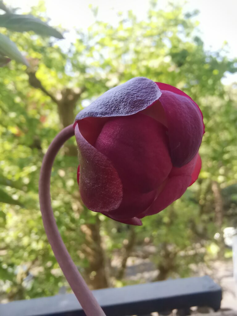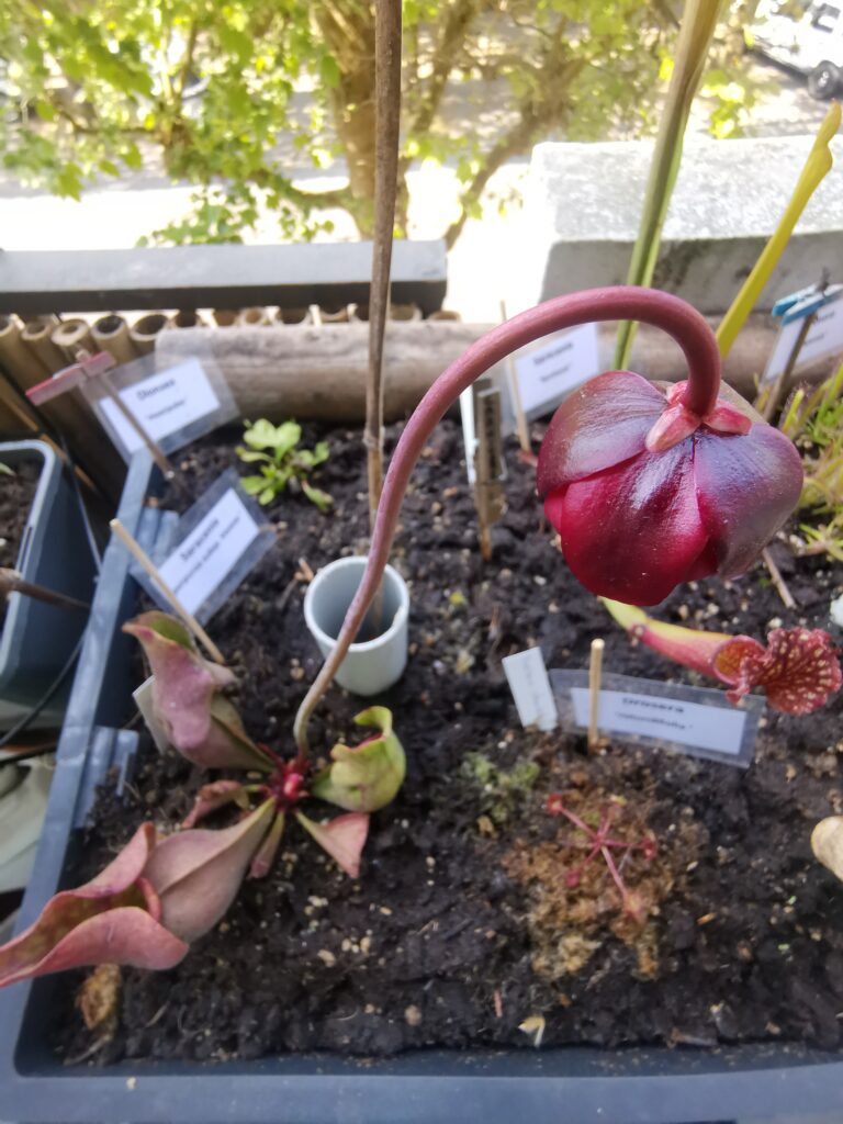 Un saracenia ‘purpura’ en début de floraison et des pièges rougeâtre