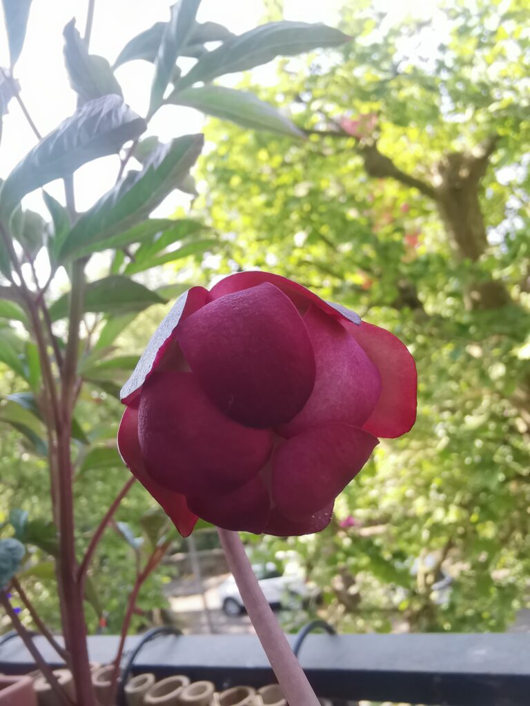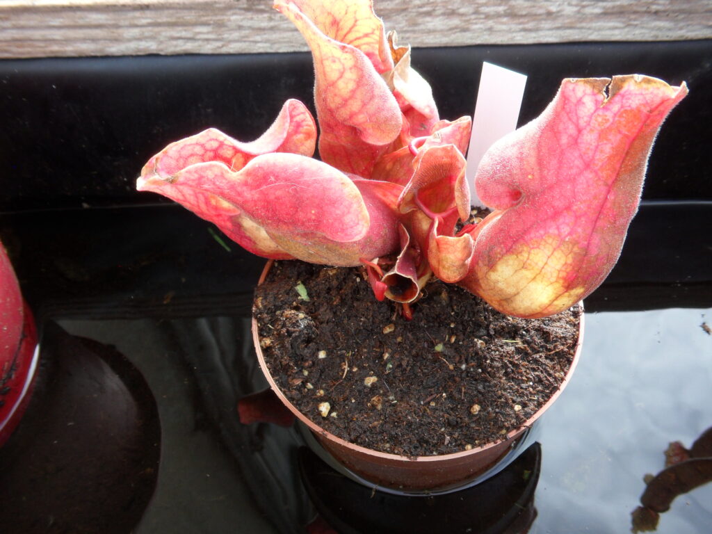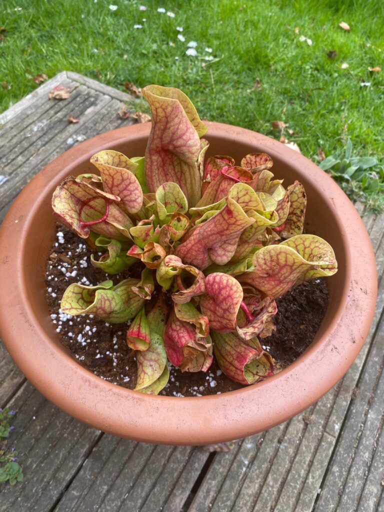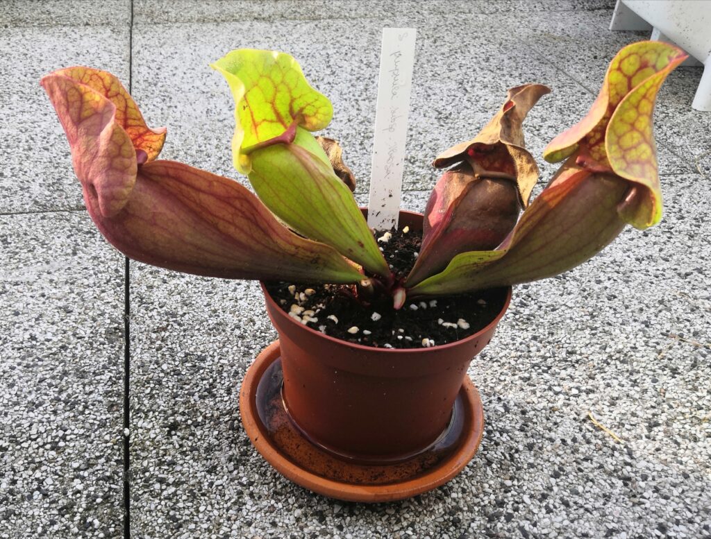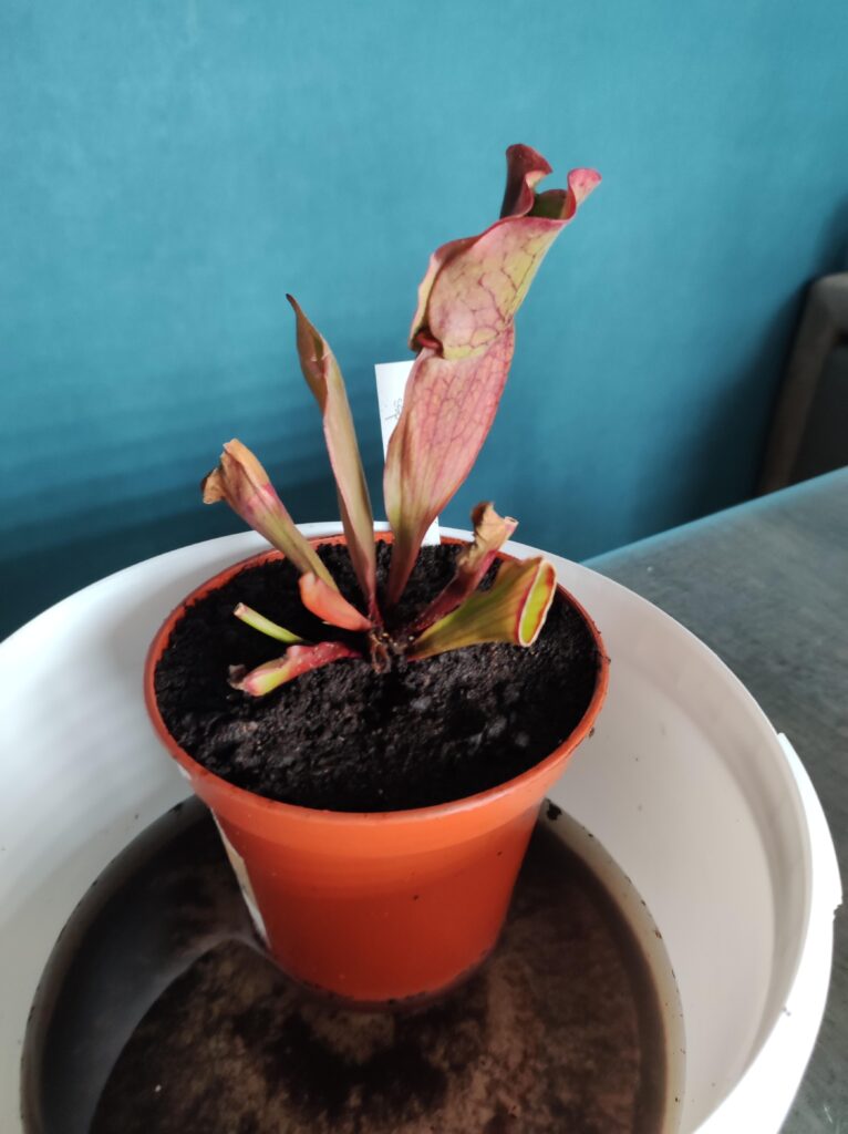 Un saracenia ‘purpura’ en début de floraison et des pièges rougeâtre