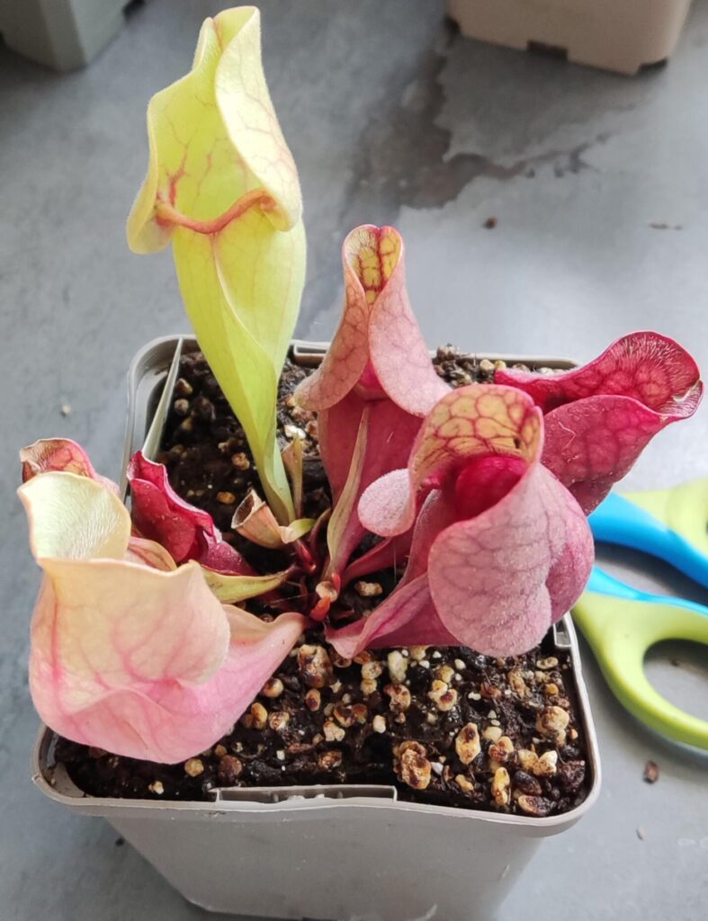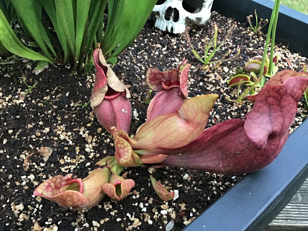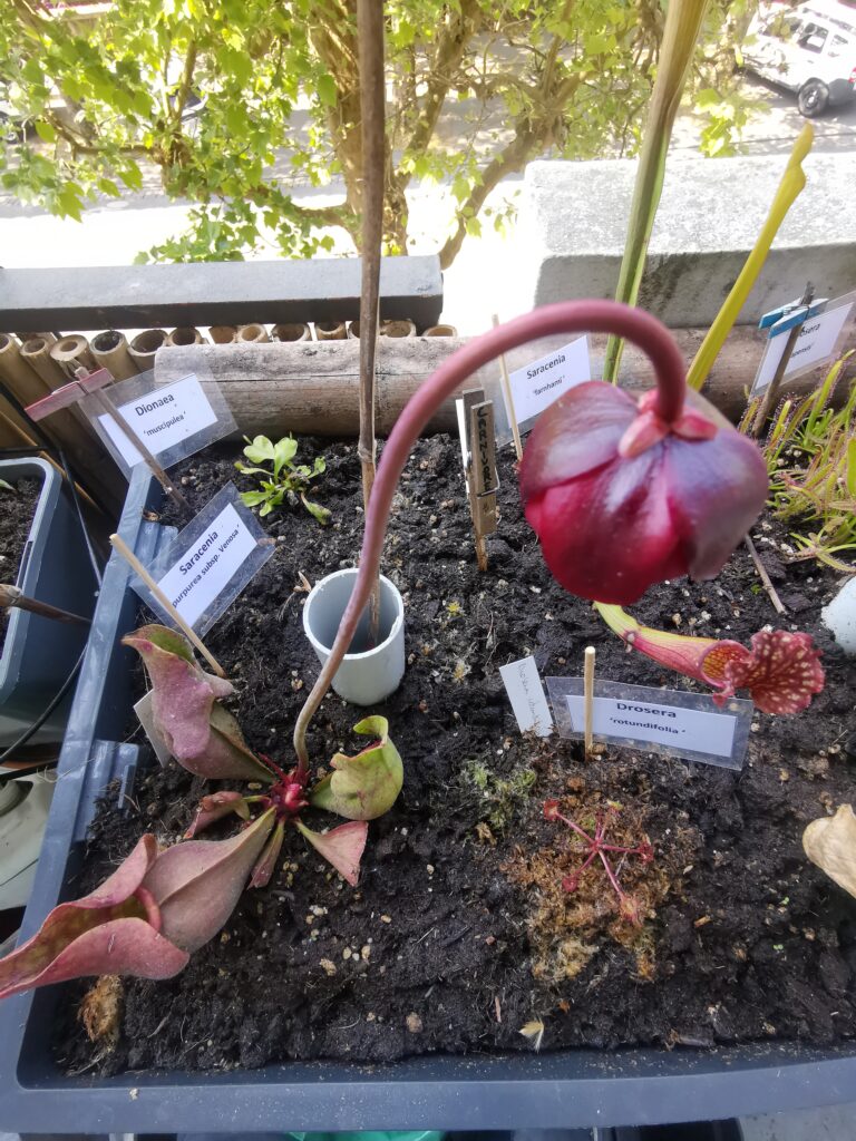 Vous voudriez trouver un Sarracenia moins rectiligne pour compléter votre grosse potée de plantes carnivores ? Sarracenia purpurea ssp. venosa trouvera parfaitement sa place avec d’autres plantes carnivores comme par exemple Dionaea muscipula.