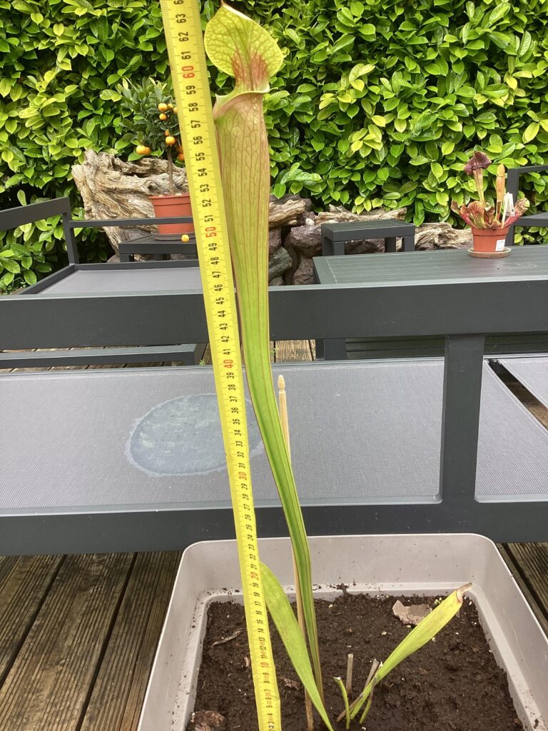 Sarracenia x Moorei ‘Leah Wilkerson’ est un hybride naturel entre Sarracenia flava et Sarracenia leucophylla aux caractéristiques bien particulières. Ce Sarracenia est l’un des plus gros, si ce n’est le plus gros ! Ses urnes peuvent atteindre des sommets et mesurer plus d’un mètre.