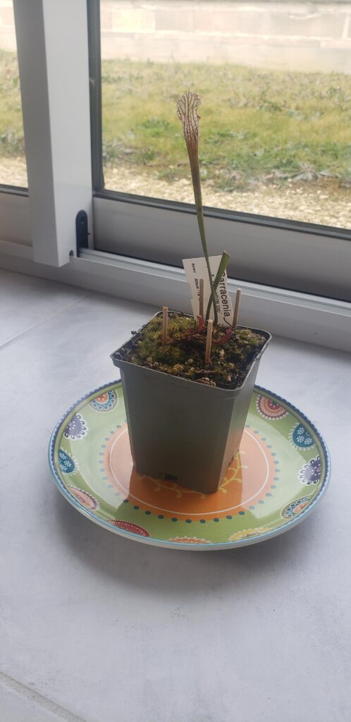 La taille du pot doit être d’1L (Ø ~ 12cm) minimum. Si vous avez de l’espace, n’ayez pas peur du ridicule ; plus votre pot plastique sera volumineux, plus votre Sarracenia aura d’espace pour se développer convenablement. Taille de pot recommandé : 3L. Vous pourrez alors y ajouter quelques plantes compagnes : Dionaea muscipula et Drosera tempérées.