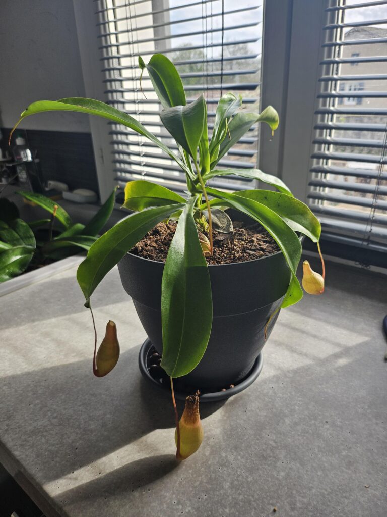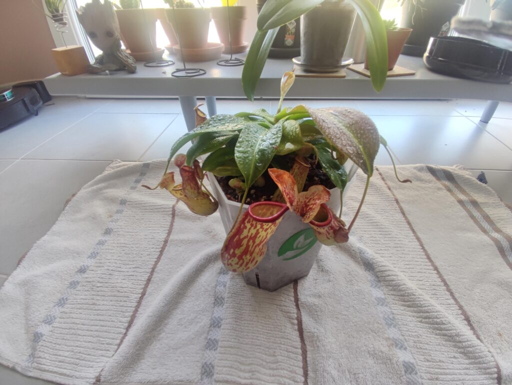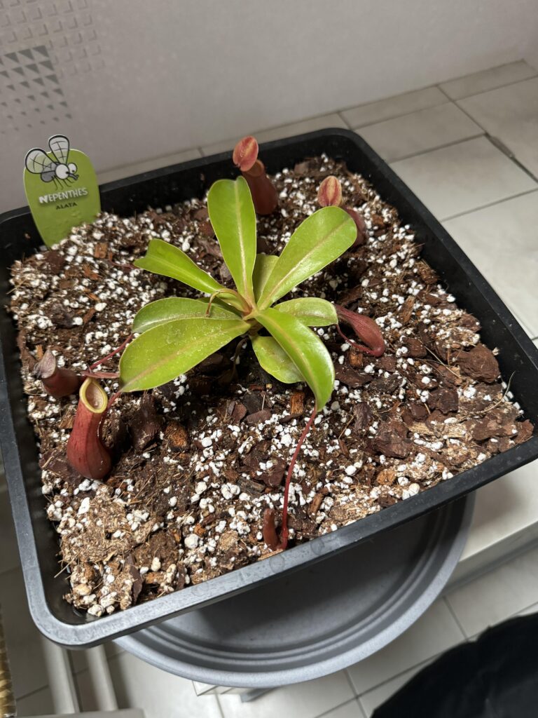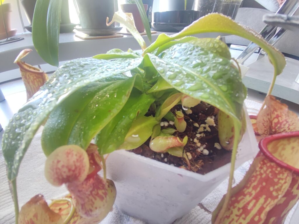 Substrat identique à celui d’origine vu que j’ai acheté mon nepenthes sur le site. Il est préférable de laisser tremper le substrat au préalable dans l’eau(osmose pour moi) avant car il boit beaucoup et fait que avec un simple arrosage celui ci sera trop sec pour le nepenthes et des urnes vont sécher. Expérience personnelle 🥹